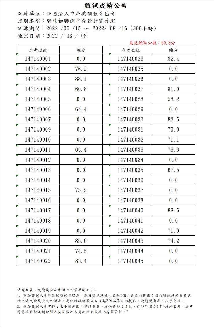 111年度_智慧物聯網平台設計實作班_成績公告