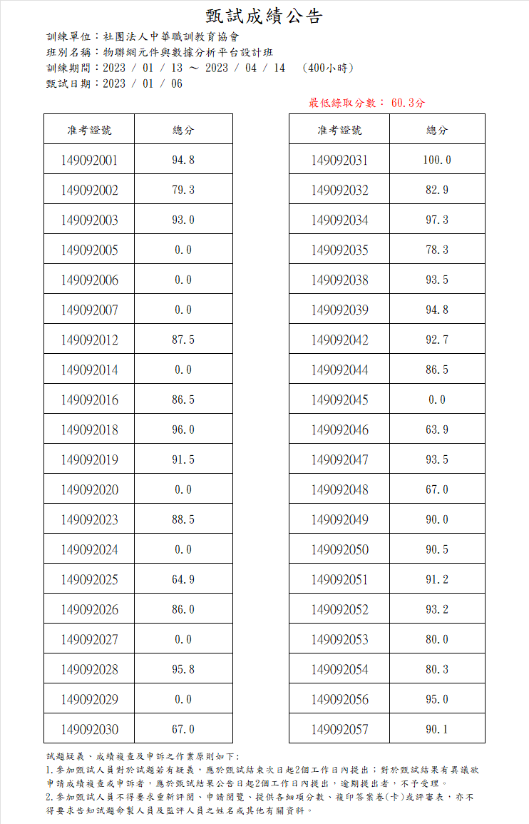 物聯網元件與數據分析平台設計班 成績公告