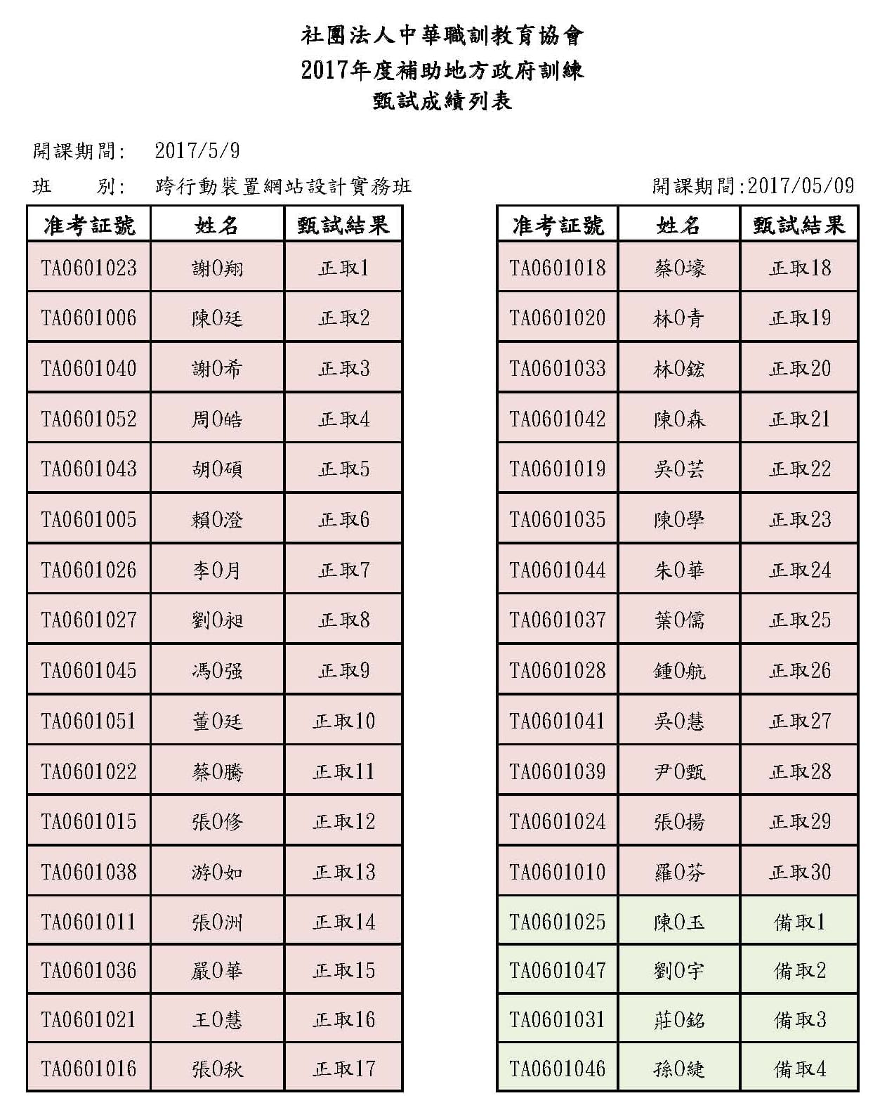 106年度_跨行動裝置網站設計實務班_甄試結果名單