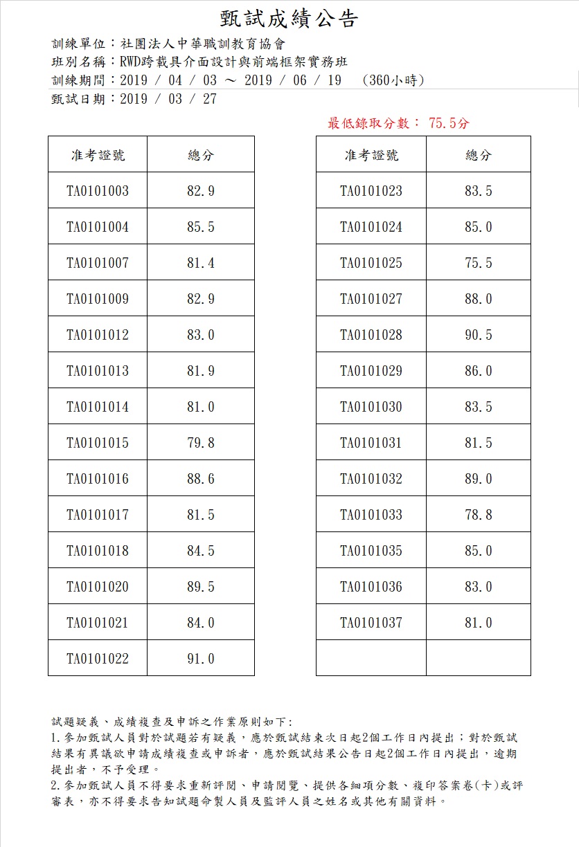 108年度_RWD跨載具介面設計與前端框架實務班_成績公告