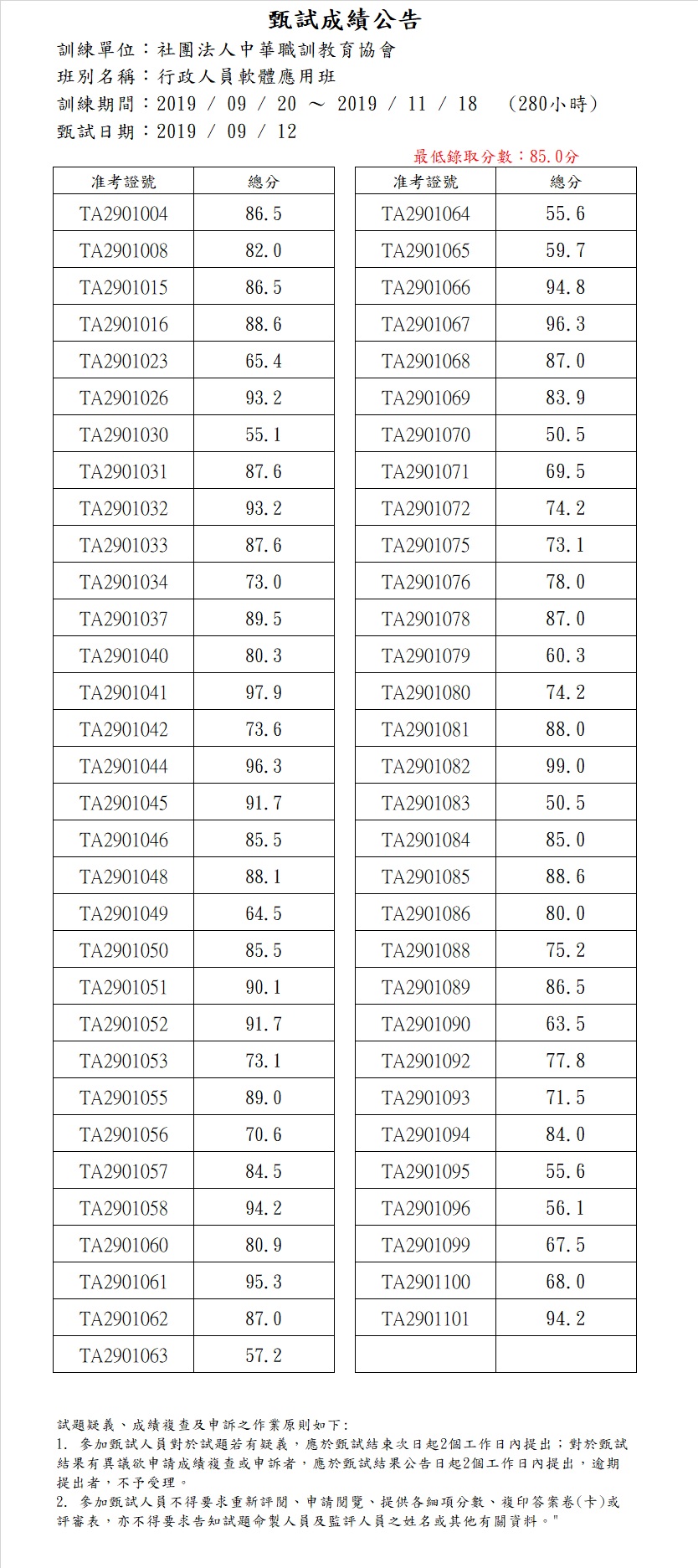 108年度_行政人員軟體應用班_成績公告